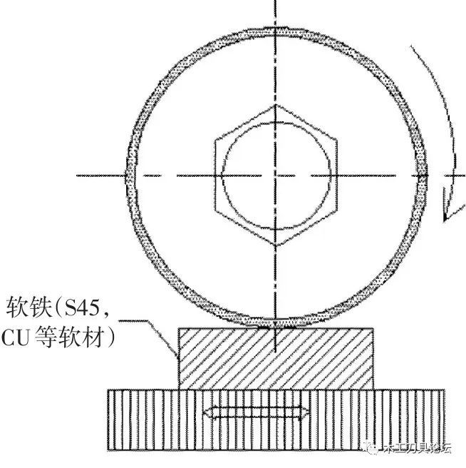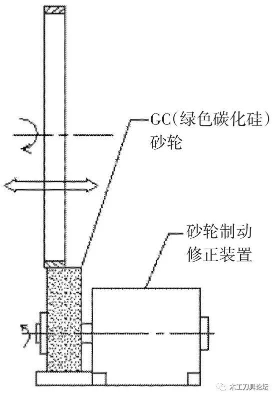 b.砂轮动平衡及修整。将做好静平衡的砂轮安装在机台主轴上锁紧。按照图3、图4方法修整:图3是借助于主砂轮的旋转力带动GC(绿色碳化硅砂轮)的旋转,通过砂轮间的速度差对砂轮进行整修及修锐。图4是较方便、简洁、常用的一种方法,它的缺点是容易修整过头,以至于砂轮寿命降低。此种方法是在对砂轮整形(真圆度)的同时进行修锐,在砂轮修整前最好在砂轮的外周用油性笔进行涂色标识(避免修整过头),让S45、Cu、红铜等软铁与之整体接触研磨(直至油性笔标识被全部磨掉消失)。修整完成后便可以进入到工作状态。